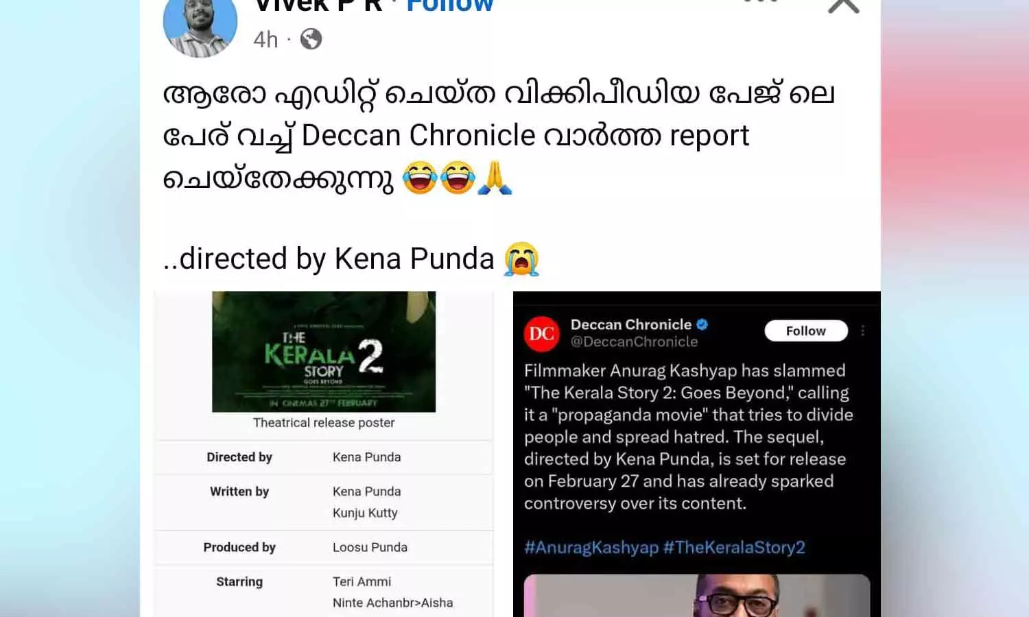 'യേ ക്യാ ഹേ?'; കേരള സ്റ്റോറിയുടെ വിക്കിപീഡിയ പേജ് തിരുത്തി വിരുതന്മാര്, പേരുകള് മാറിയത് അറിയാതെ ദേശീയമാധ്യമങ്ങള്