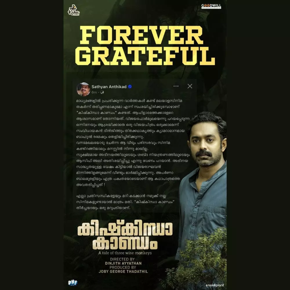 "മാധ്യമങ്ങളിൽ പ്രചരിക്കുന്ന വാർത്തകൾ കണ്ട് മലയാളസിനിമ തകർന്ന് തരിപ്പണമാകുമോ എന്ന് സംശയിച്ചിരിക്കുമ്പോഴാണ് "കിഷ്കിന്ധാ കാണ്ഡം" കണ്ടത്, എന്നാണ് സത്യൻ അന്തിക്കാട് ഫെയ്സ്ബുക്കിൽ കുറിച്ചത്.