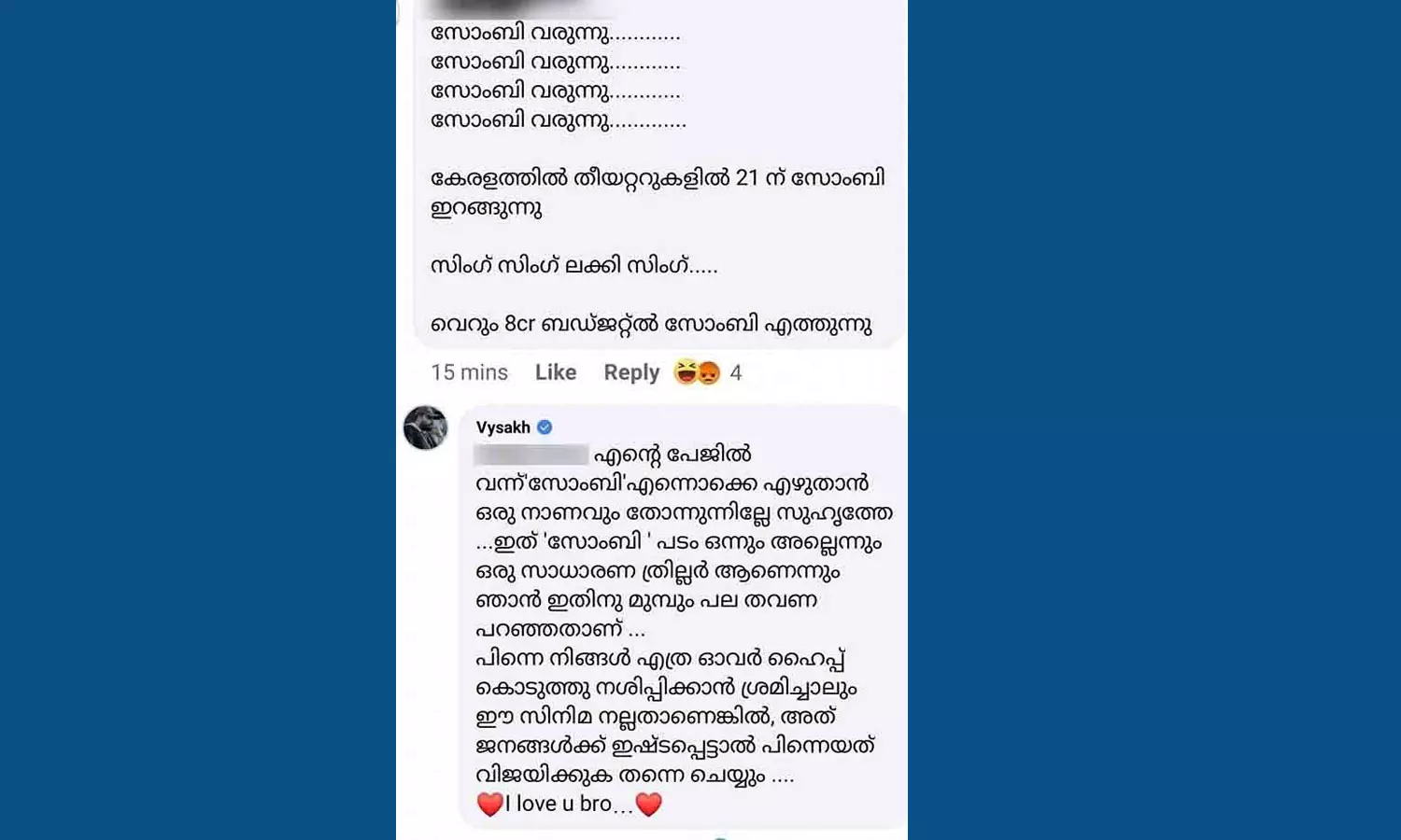 വൈശാഖിൻറെ ഫേസ്ബുക്ക് പോസ്റ്റിനു താഴെയുള്ള കമന്റിനാണ് മറുപടി നൽകിയത്. എൻറെ പേജിൽ വന്ന് സോംബി എന്നൊക്കെ എഴുതാൻ ഒരു നാണവും തോന്നുന്നില്ലേ സുഹൃത്തേ... ഇത് സോംബി പടമൊന്നും അല്ലെന്നും ഒരു സാധാരണ ത്രില്ലർ ആണെന്നും ഞാൻ ഇതിനു മുൻപും പലതവണ പറഞ്ഞതാണ്. പിന്നെ നിങ്ങൾ എത്ര ഓവർ ഹൈപ്പ് കൊടുത്ത് നശിപ്പിക്കാൻ ശ്രമിച്ചാലും ഈ സിനിമ നല്ലതാണെങ്കിൽ അത് ജനങ്ങൾക്ക് ഇഷ്ടപ്പെട്ടാൽ പിന്നെയത് വിജയിക്കുക തന്നെ ചെയ്യും. ഐ ലവ് യൂ ബ്രോ, എന്നായിരുന്നു വൈശാഖിൻറെ പ്രതികരണം.