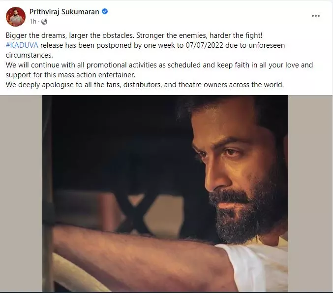 അപ്രതീക്ഷിത സാഹചര്യങ്ങൾ, ശക്തരായ ശത്രുക്കൾ; 'കടുവ' റിലീസ് തിയ്യതി മാറ്റിയതായി പൃഥ്വിരാജ്