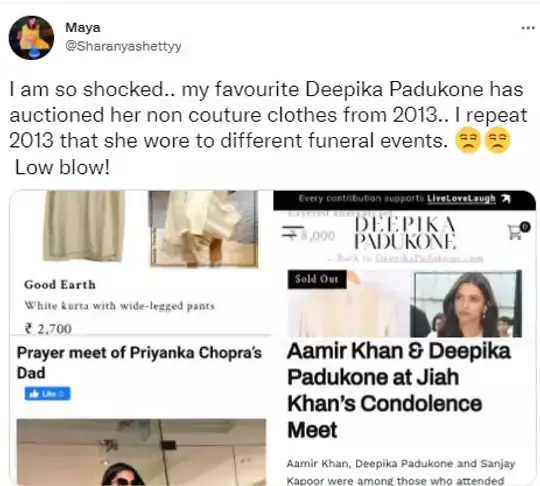 8000, 2700, 2100 നിരക്കിലാണ് വസ്ത്രങ്ങൾ വിൽക്കുന്നത്. ഇതോടൊപ്പം ദീപിക ധരിച്ച ചെരുപ്പും വിൽക്കുന്നുണ്ട്. നടിയുടെ പിആർ ടീമാണ് ഇതിനു പിന്നാലെന്ന് വിമർശകർ ആരോപിച്ചു. ആരാധകരോട് ആദരവുണ്ടെങ്കിൽ ഈ വസ്ത്രങ്ങൾ ലേലത്തിൽ വയ്ക്കില്ലായിരുന്നു എന്നും അവർ ചൂണ്ടിക്കാട്ടുന്നു.