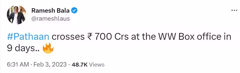 ഫിലിം ട്രേഡ് അനലിസ്റ്റ് രമേഷ് ബാലയാണ് വെള്ളിയാഴ്ച ട്വിറ്ററിൽ പഠാന്‍റെ കലക്ഷന്‍ റിപ്പോര്‍ട്ട് പുറത്തുവിട്ടത്