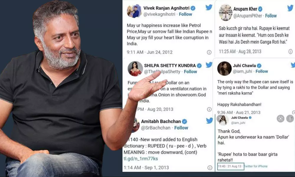 രൂപയുടെ മൂല്യം ചരിത്രത്തിലെ ഏറ്റവും വലിയ ഇടിവ് രേഖപ്പെടുത്തിയ പശ്ചാത്തലത്തില് ബോളിവുഡ് താരങ്ങളുടെയും സംവിധായകരുടെയും പഴയ ട്വീറ്റുകള് വീണ്ടും പങ്കുവെച്ച് നടന് പ്രകാശ് രാജ്. യു.പി.എ സര്ക്കാര് അധികാരത്തിലിരുന്ന കാലഘട്ടത്തിലെ ട്വീറ്റുകളാണ് പ്രകാശ് രാജ് 'പൊക്കിയത്'. 'പണ്ടുപണ്ടൊരിക്കല് എന്റെ നാട്ടിൽ...', എന്ന തലക്കെട്ടിലാണ് ട്വീറ്റുകള് പങ്കുവെച്ചത്. പ്രത്യക്ഷത്തില് വലതുപക്ഷ രാഷ്ട്രീയം പിന്തുടരുന്ന സംവിധായകന് വിവേക് രഞ്ജന് അഗ്നിഹോത്രി, നടന് അനുപം ഖേര് എന്നിവരുടെ ട്വീറ്റുകളും പ്രകാശ് രാജ് പങ്കുവെച്ച ട്വീറ്റുകളില് ഉള്പ്പെടുത്തിയിട്ടുണ്ട്. ബോളിവുഡ് നടിമാരായ ശില്പ ഷെട്ടി, ജൂഹി ചൌള, നടന് അമിതാഭ് ബച്ചന് എന്നിവരുടെയും ട്വീറ്റുകളും പ്രകാശ് രാജ് പങ്കുവെച്ചരിലുണ്ട്.