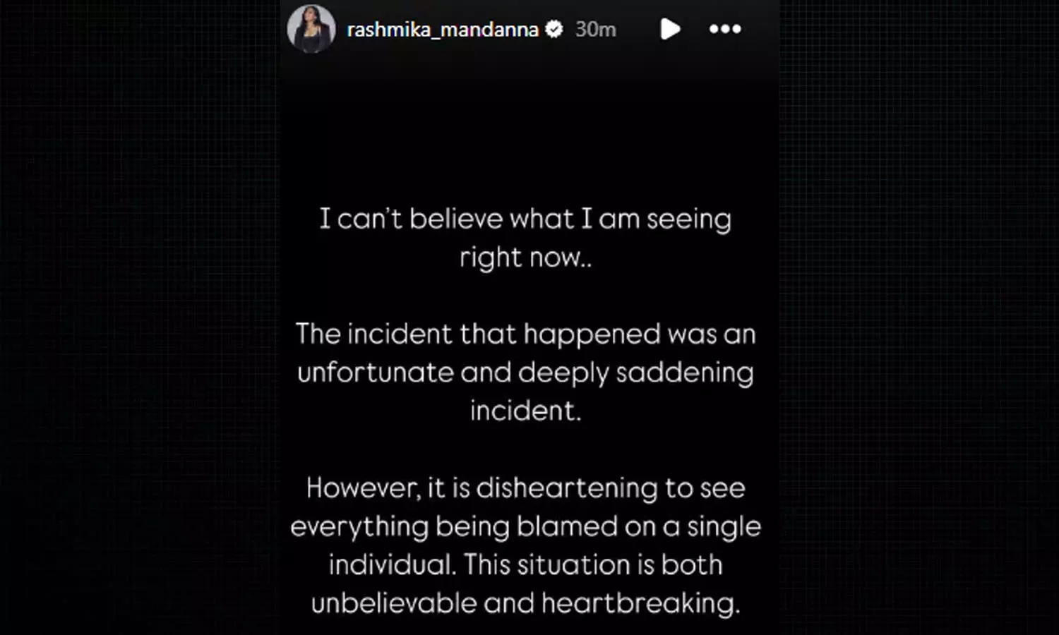 'ഈ കാണുന്നതൊന്നും എനിക്ക് വിശ്വസിക്കാനാവുന്നില്ല. ഇപ്പോള് സംഭവിച്ചുകൊണ്ടിരിക്കുന്ന കാര്യങ്ങൾ തീര്ത്തും ദൗര്ഭാഗ്യകരവും സങ്കടകരവുമാണ്. എല്ലാ കുറ്റവും ഒരാളുടെ മേല് മാത്രം ചാര്ത്തുന്നത് ശരിയല്ല. ഇപ്പോഴത്തെ സാഹചര്യം തീര്ത്തും അവിശ്വസനീയവും ഹൃദയഭേദകവുമാണ്'- രശ്മിക ഇൻസ്റ്റഗ്രാം സ്റ്റോറിയിൽ കുറിച്ചു. പുഷ്പ 2 സിനിമ പ്രദര്ശനത്തിനിടെ തിയേറ്ററിലുണ്ടായ തിക്കിലും തിരക്കിലും യുവതി മരിച്ച സംഭവത്തിലാണ് നടന് അല്ലു അര്ജുന് അറസ്റ്റിലായത്. 'പുഷ്പ' യിൽ അല്ലു അര്ജുന്റെ സഹതാരമാണ് രശ്മിക മന്ദാന.
