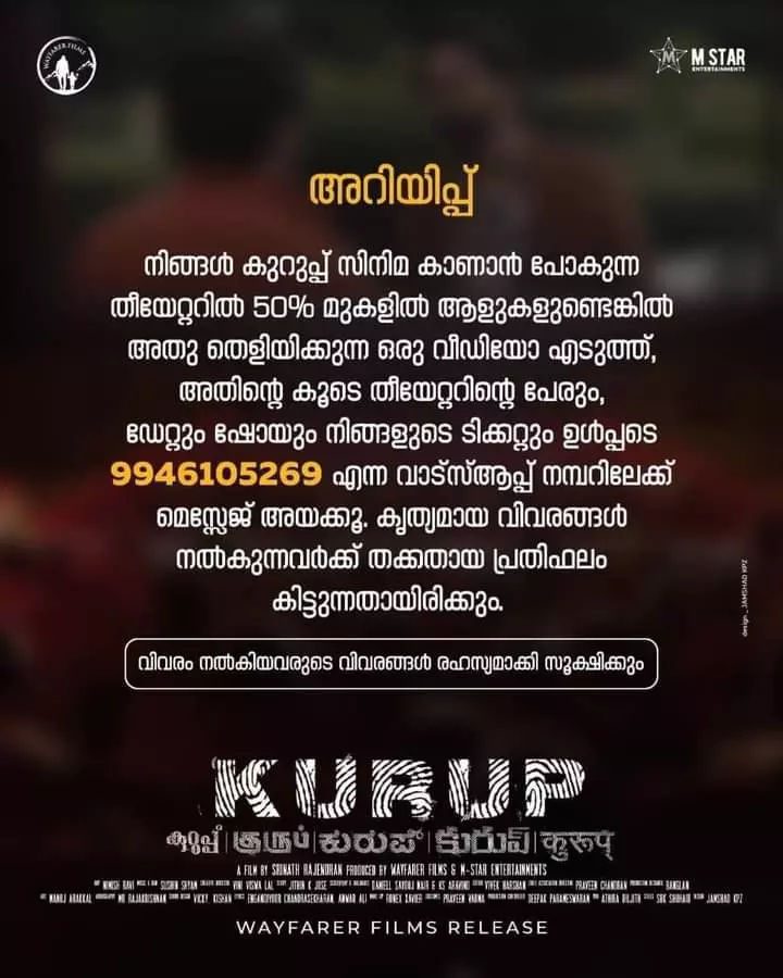 കുറുപ്പിനെ ചതിക്കുന്ന തിയറ്ററുകളെക്കുറിച്ച് വിവരം നല്കുന്നവര്ക്ക് പ്രതിഫലം