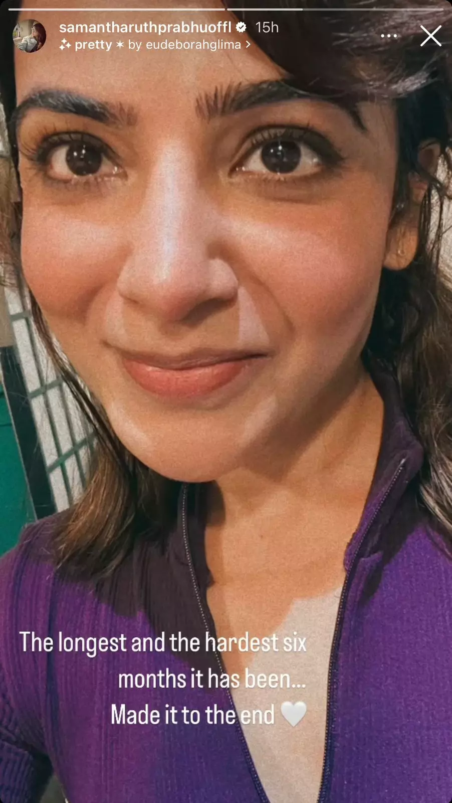ഞായറാഴ്ച ഇടവേളയെക്കുറിച്ച് സൂചന നൽകുന്ന രണ്ട് പോസ്റ്റുകളാണ് സാമന്ത ഇന്സ്റ്റഗ്രാം സ്റ്റോറിയില് ഷെയര് ചെയ്തത്. കാരവാനില് നിന്നുള്ള ഫോട്ടോയാണ് ആദ്യത്തേത്. 'കാരവാന് ജീവിതം...മൂന്നു ദിവസം കൂടി' എന്ന് ഇതോടൊപ്പം കുറിച്ചിരിക്കുന്നു. ഒരു സെല്ഫിയാണ് രണ്ടാമത്തേത്. "ഏറ്റവും ദൈർഘ്യമേറിയതും കഠിനവുമായ ആറ് മാസങ്ങൾ'' എന്നാണ് ഇതിനു അടിക്കുറിപ്പ് നില്കിയത്.