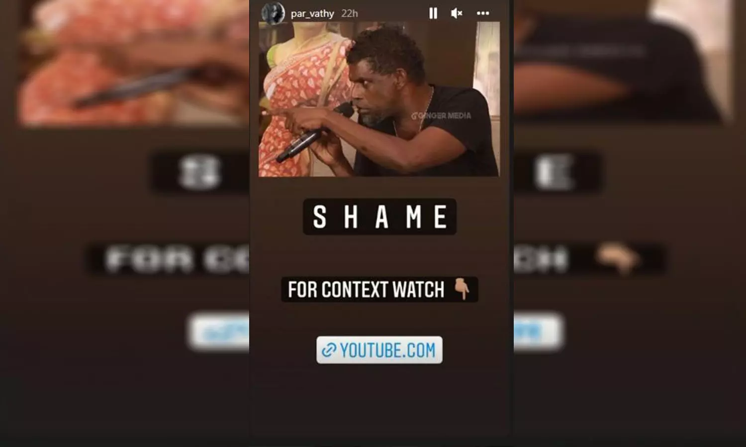 ഒരുത്തീ സിനിമയുടെ വാർത്താ സമ്മേളനത്തിൽ മീ ടു സംബന്ധിച്ച് നടൻ വിനായകൻ നടത്തിയ പരാമർശത്തിൽ പ്രതികരണവുമായി നടി പാർവതി തിരുവോത്ത്. ഇൻസ്റ്റാഗ്രാം സ്റ്റോറിയിൽ വിനായകന്റെ ചിത്രം പങ്കുവച്ചു കൊണ്ടായിരുന്നു പാർവതിയുടെ പ്രതികരണം. ചിത്രത്തോടൊപ്പം 'ഷെയിം' എന്ന് കുറിച്ചാണ് ചിത്രം പങ്കു വെച്ചിരിക്കുന്നത്. ഇതിനൊപ്പം സംവിധായക കുഞ്ഞില മാസിലമണി എഴുതിയ ലേഖനവും താരം പങ്കുവെച്ചു.