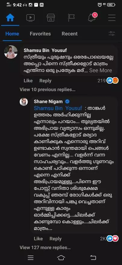 താങ്കള് ഉത്തരം അര്ഹിക്കുന്നില്ല എന്നാലും പറയാം, തുല്യതയില് അഭിപ്രായ വ്യത്യാസമൊന്നുമില്ല. പക്ഷേ സ്ത്രീകളോട് മര്യാദ കാണിക്കുക എന്നൊരു അറിവ് ഉണ്ടാകാന് സ്വന്തമായി പെങ്ങള് വേണമെന്നില്ല. വളര്ന്നുവരുന്ന സാഹചര്യവും വളര്ത്തുഗുണവുംകൊണ്ട് പഠിക്കുന്ന ഒന്നാണ് എന്നെ എനിക്ക് അഭിപ്രായമുള്ളൂ. പിന്നെ ഈ പോസ്റ്റ് വനിതാ ശിശുക്ഷേമ വകുപ്പ് ഞരമ്പുരോഗികള്ക്ക് ഒരു അറിവിനായി പങ്കുവെച്ചതാണ് എന്നുള്ള കാര്യ ഓര്മിപ്പിക്കട്ടെ. ചിലര്ക്ക് കാണുമ്പോ കൊള്ളും, ചിലര്ക്ക് മാത്രം.- ഷെയിന് കുറിച്ചു.