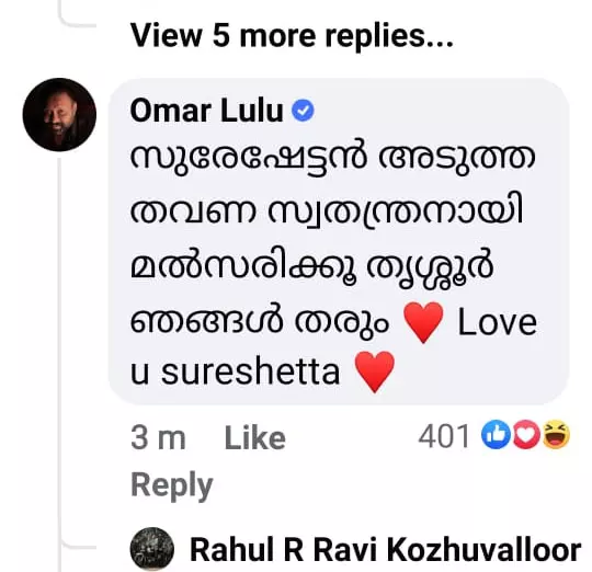 |'സുരേഷേട്ടൻ അടുത്ത തവണ സ്വതന്ത്രനായി മത്സരിക്കൂ. തൃശൂർ ഞങ്ങൾ തരും. ലവ് യു സുരേഷേട്ടാ..' എന്നാണ് സംവിധായൻ ഒമർ ലുലു കമന്റ് ചെയ്തത്.