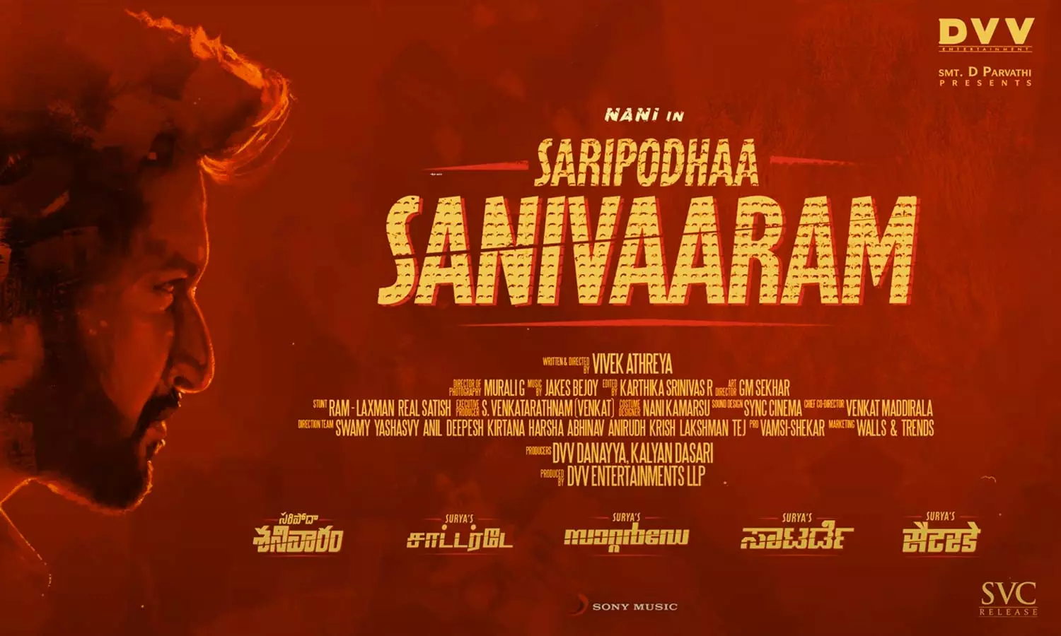 പ്രേക്ഷകരുടെ പ്രിയതാരമായ നാനിക്ക് പിറന്നാൾ ആശംസകൾ നേർന്ന് ടീം 'സരിപോദാ ശനിവാരം' ബർത്ത്ഡേ സ്പെഷൽ പോസ്റ്റർ പുറത്തിറക്കി. പോസ്റ്ററിനോടൊപ്പം ചിത്രത്തിന്റെ ടീസറും റിലീസ് ഡേറ്റും അണിയറ പ്രവർത്തകർ പുറത്തുവിട്ടിട്ടുണ്ട്.