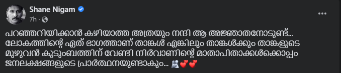 'ജനലക്ഷങ്ങളുടെ പ്രാര്ത്ഥനയുണ്ടാകും'; നിര്വാന് 11 കോടി നൽകിയ അജ്ഞാതന് നന്ദിയറിയിച്ച് ഷെയിന് നിഗം