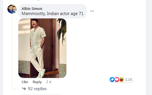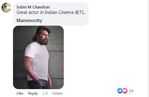 മമ്മൂട്ടിയുടെ സ്റ്റൈലന് ലുക്കിലുള്ള ഫോട്ടോകള് ആരാധകര് കമന്റുകളായി പോസ്റ്റ് ചെയ്തിട്ടുണ്ട്. ഇതാ ഞങ്ങളുടെ 71കാരന് മമ്മൂട്ടി, മമ്മൂട്ടി, ഇന്ത്യന് ആക്ടര്, ഏജ്-71, മമ്മൂട്ടിയുടെ മുഴുവന് പേരും ജന്മദിനവും വീടും കുടുംബവിവരങ്ങളും അടക്കവും ചില ആരാധകര് കമന്റ് ചെയ്തിട്ടുണ്ട്. ഇതിനിടയില് 70ഉം 80ഉം വയസുള്ള മാതാപിതാക്കളുടെ ഫോട്ടോകളും ചിലര് പങ്കുവയ്ക്കുന്നുണ്ട്.