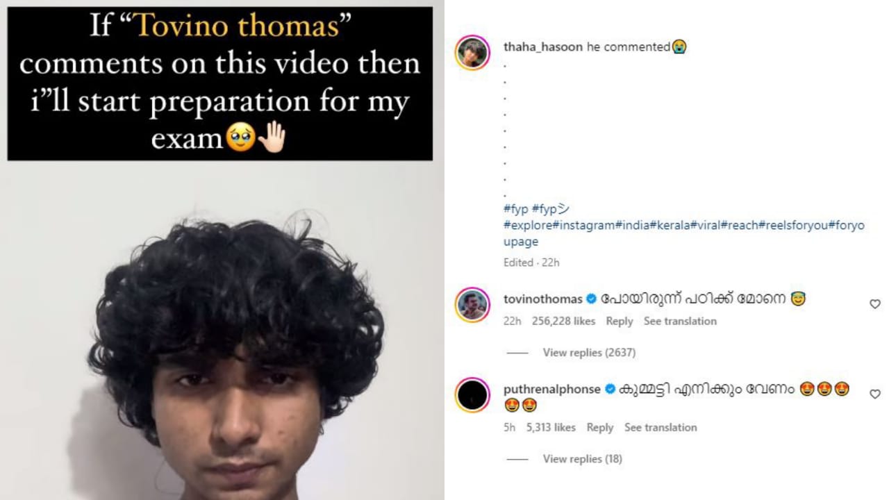താഹ ഹസൂൻ എന്ന ഇൻസ്റ്റഗ്രാം അക്കൗണ്ടിൽ നിന്ന് പോസ്റ്റ് ചെയ്ത ഒരു വീഡിയോയ്ക്ക് മറുപടിയുമായാണ് ടൊവിനോ എത്തിയിരിക്കുന്നത്. 'ഈ വീഡിയോയ്ക്ക് ടൊവിനോ തോമസ് കമന്റ് ചെയ്താൽ ഞാൻ എന്റെ പരീക്ഷക്കുള്ള തയാറെടുപ്പുകൾ ആരംഭിക്കും' എന്ന ക്യാപ്ഷനോടെയായിരുന്നു ഇൻസ്റ്റഗ്രാം പേജിൽ വീഡിയോ പോസ്റ്റ് ചെയ്തിരുന്നത്. 'പോയിരുന്ന് പഠിക്ക് മോനെ' എന്നായിരുന്നു ഇതിന് ടൊവിനോയുടെ മറുപടി. വീഡിയോ പോസ്റ്റ് ചെയ്ത് രണ്ട് ദിവസത്തിനകമായിരുന്നു ടൊവിനോയുടെ പ്രതികരണമെത്തിയത്.
