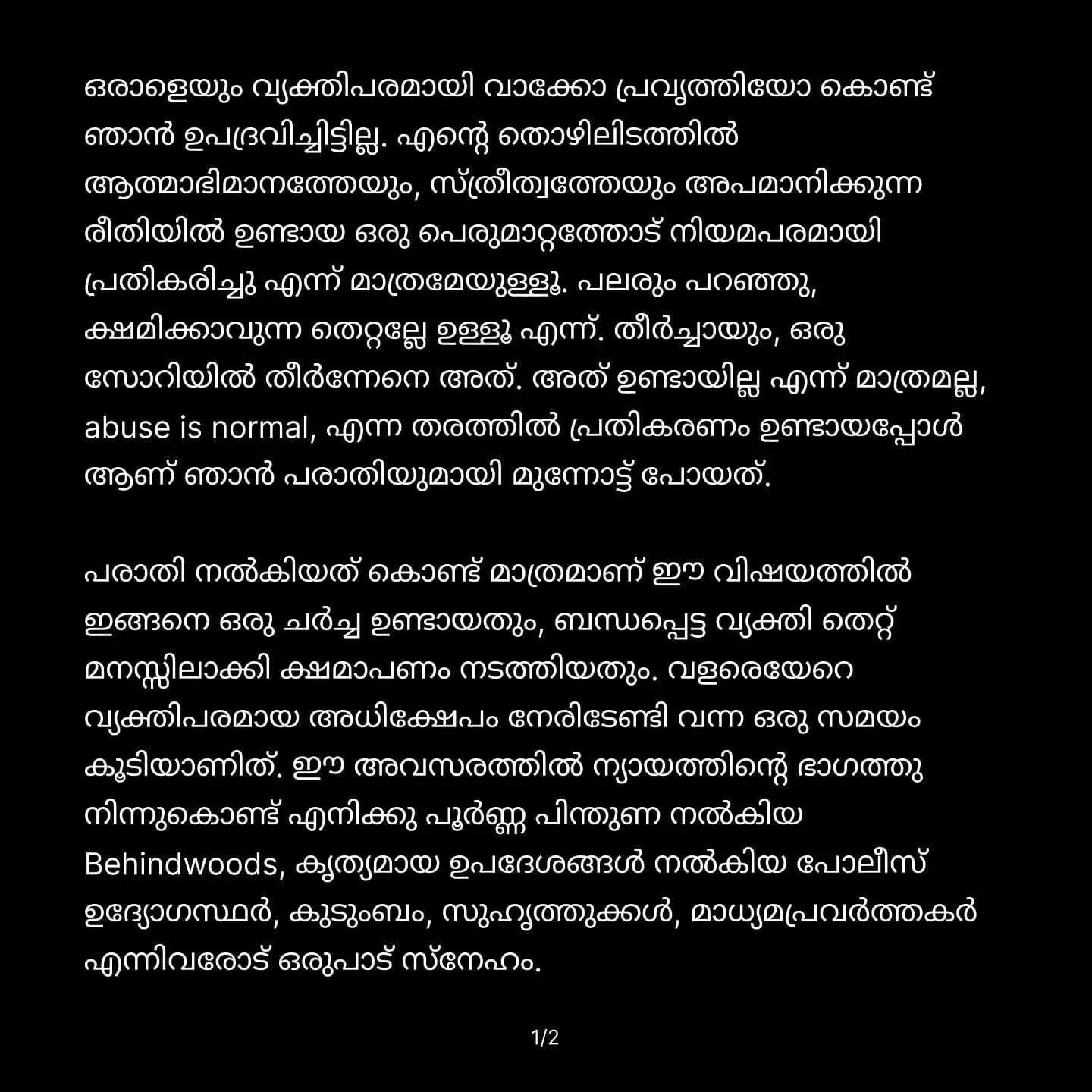 ഒരാളെയും വ്യക്തിപരമായി വാക്കോ പ്രവൃത്തിയോ കൊണ്ട് ഞാൻ ഉപവിച്ചിട്ടില്ല. എന്റെ തൊഴിലിടത്തിൽ ആത്മാഭിമാനത്തെയും, സ്ത്രീത്വത്തെയും അപമാനിക്കുന്ന രീതിയിൽ ഉണ്ടായ ഒരു പെരുമാറ്റത്തോട് നിയമപരമായി പ്രതികരിച്ചു എന്ന് മാത്രമേയുള്ളു. പലരും പറഞ്ഞു. ക്ഷമിക്കാവുന്ന തെറ്റല്ലേ ഉള്ളൂ എന്ന് തീർച്ചായും, ഒരു സോറിയിൽ തീർന്നേനെ അത്. അത് ഉണ്ടായില്ല എന്ന് മാത്രമല്ല, abuse is normal എന്ന തരത്തിൽ പ്രതികരണം ഉണ്ടായപ്പോൾ ആണ് ഞാൻ പരാതിയുമായി മുന്നോട്ട് പോയത്.