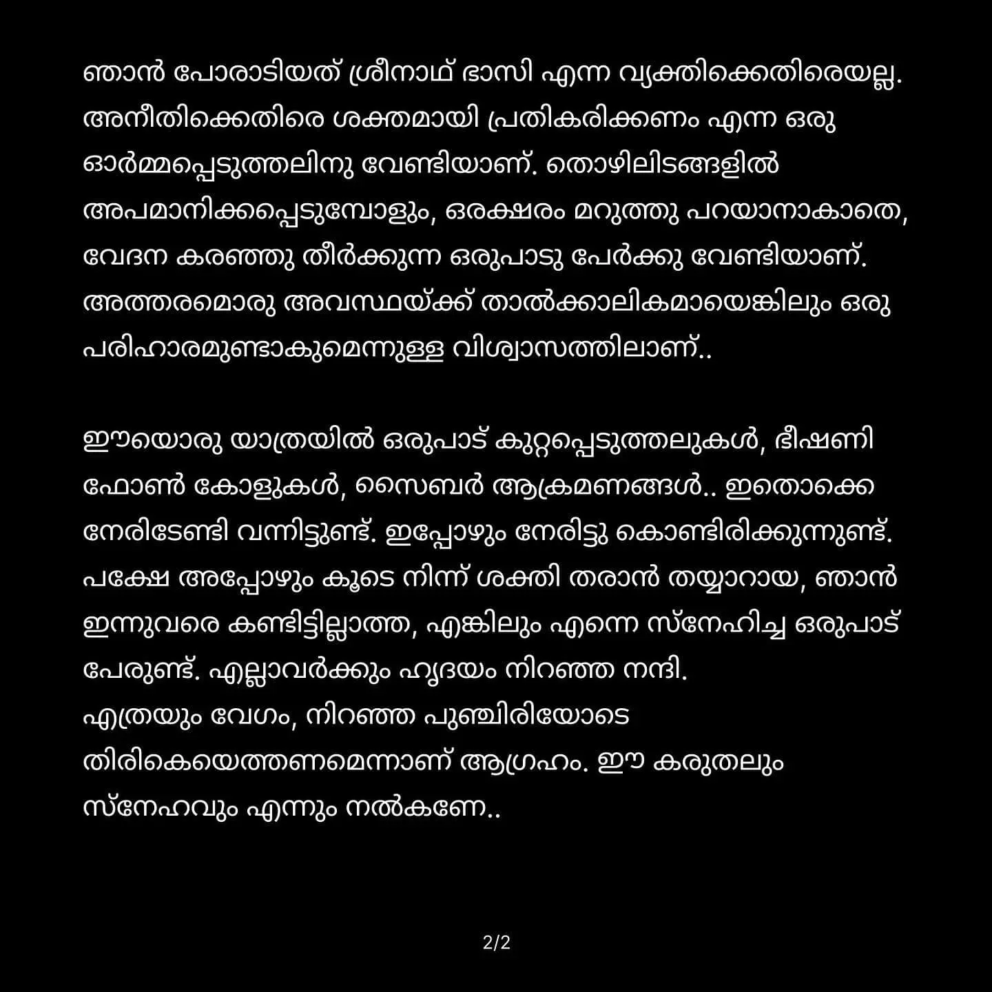 ഈയൊരു യാത്രയിൽ ഒരുപാട് കുറ്റപ്പെടുത്തലുകൾ, ഭീഷണി ഫോൺ കോളുകൾ, സൈബർ ആക്രമണങ്ങൾ, ഇതൊക്കെ നേരിടേണ്ടി വന്നിട്ടുണ്ട്. ഇപ്പോഴും നേരിട്ടു കൊണ്ടിരിക്കുന്നുണ്ട്. പക്ഷേ അപ്പോഴും കൂടെ നിന്ന് ശക്തി തരാൻ തയ്യാറായ ഞാൻ ഇന്നുവരെ കണ്ടിട്ടില്ലാത്ത, എങ്കിലും എന്നെ സ്നേഹിച്ച ഒരുപാട് പേരുണ്ട്. എല്ലാവർക്കും ഹൃദയം നിറഞ്ഞ നന്ദി. എത്രയും വേഗം നിറഞ്ഞ പുഞ്ചിരിയോടെ തിരികെയെത്തണമെന്നാണ് ആഗ്രഹം. ഈ കരുതലും സ്നേഹവും എന്നും നൽകണം.