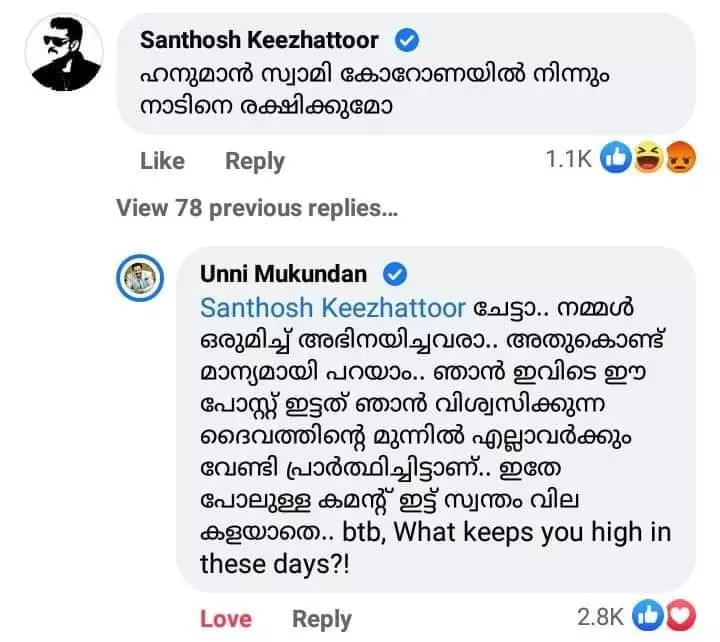 തൊട്ടുപിന്നാലെ മറുപടിയുമായി ഉണ്ണി മുകന്ദന് തന്നെ രംഗത്ത് എത്തി. ചേട്ടാ നമ്മള് ഒരുമിച്ച് അഭിനയിച്ചവരാ. അതുകൊണ്ട് മാന്യമായി പറയാം. ഞാന് ഇവിടെ ഈ പോസ്റ്റിട്ടത് ഞാന് വിശ്വസിക്കുന്ന ദൈവത്തിന് മുന്നില് എല്ലാവര്ക്കും വേണ്ടി പ്രാര്ത്ഥിച്ചിട്ടാണ്. ഇതേപോലുള്ള കമന്റ് ഇട്ട് സ്വന്തം വില കളയാതെ എന്നായിരുന്നു ഉണ്ണി മുകുന്ദന് മറുപടി നല്കിയത്. ഉണ്ണിയെ അനുകൂലിച്ചും പ്രതികൂലിച്ചും നിരവധി പേരാണ് രംഗത്തെത്തിയത്.