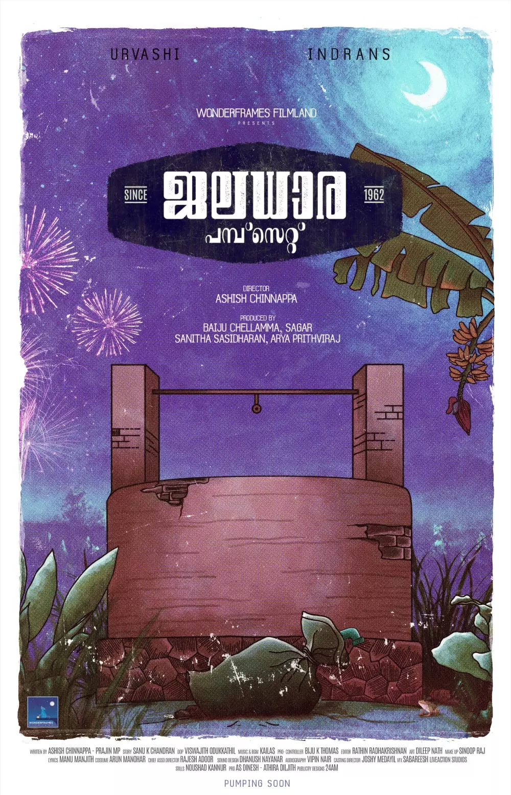 ഇന്ദ്രൻസ്, ഉർവശി എന്നിവരെ പ്രധാന കഥാപാത്രങ്ങളാക്കി ആഷിഷ് ചിന്നപ്പ സംവിധാനം നിർവഹിക്കുന്ന ജലധാര പമ്പ്സെറ്റ് സിൻസ് 1962 എന്ന ചിത്രത്തിന്റെ ടൈറ്റിൽ ലുക്ക് പുറത്തിറങ്ങി. ആക്ഷേപഹാസ്യ ഗണത്തിൽപ്പെടുന്ന ചിത്രത്തിന്റെ നിർമ്മാണം വണ്ടർഫ്രെയിംസ് ഫിലിംലാൻഡിന്റെ ബാനറിൽ ബൈജു ചെല്ലമ്മ, സാഗർ, സനിത ശശിധരൻ, ആര്യ പൃഥ്വിരാജ് എന്നിവർ ചേർന്നാണ്. ഇവരുടെ പ്രഥമ നിർമ്മാണ സംരംഭമാണ് ഈ ചിത്രം.