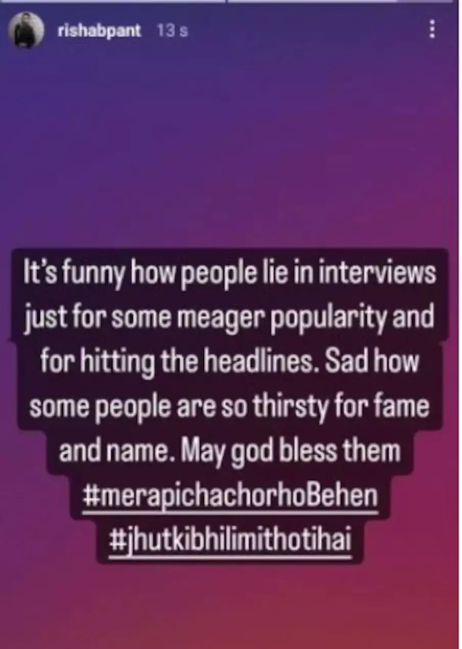'വാർത്തകളിൽ നിറഞ്ഞു നിൽക്കാനും വിലകുറഞ്ഞ ജനപ്രീതിക്ക് വേണ്ടിയും ചിലർ നുണ പറയുന്നത് കാണുമ്പോൾ കൗതുകം തോന്നുന്നു. പ്രശസ്തിക്കും പേരിനും വേണ്ടിയുള്ള ചിലരുടെ ദാഹം കാണുമ്പോൾ സങ്കടം വരുന്നു. ദൈവം അവരെ അനുഗ്രഹിക്കട്ടെ.' മേരെപീച്ചെ ചോർഹോ ബെഹൻ, ജൂട് കീ ഭീലിമിറ്റ് ഹോതീഹെ എന്നീ ഹാഷ്ടാഗുകളിൽ റിഷഭ് പന്ത് കുറിച്ചു. കുറച്ചു നേരത്തിന് ശേഷം റിഷഭ് പോസ്റ്റ് ഡിലീറ്റു ചെയ്തു.