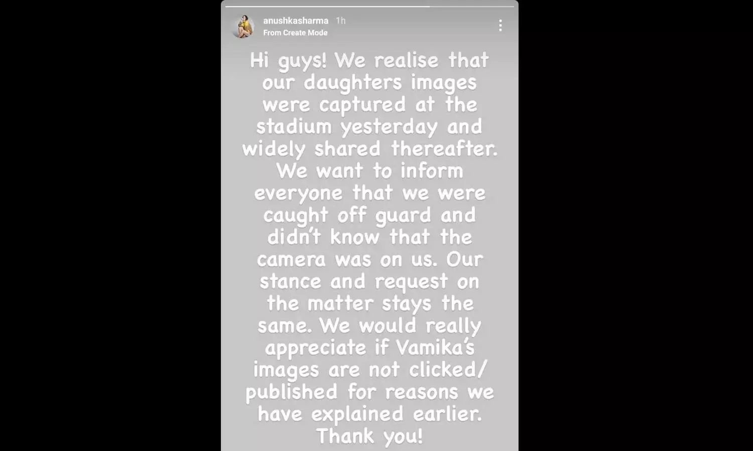 മത്സത്തിനിടെ ക്യാമറകൾ മകളുടെ ചിത്രം പകർത്തുന്ന കാര്യം അറിയില്ലായിരുന്നുവെന്നും ഈ വിഷയത്തിൽ തങ്ങളുടെ നിലപാടും അഭ്യർഥനയും അതേപടി തുടരുന്നതായും കോഹ്ലിയും അനുഷ്കയും ഇൻസ്റ്റഗ്രാം സ്റ്റോറിയിലൂടെ അറിയിച്ചു.