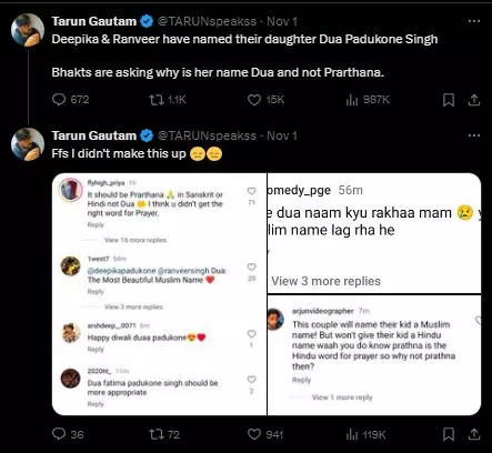 പൂജ, പ്രാർഥന എന്നിങ്ങനെ എന്തൊക്കെ പേരുകളുണ്ടായിരുന്നു എന്നാണ് അതൃപ്തി പ്രകടമാക്കി പലരുടെയും കമന്റ്. എന്തിനാണ് കുഞ്ഞിന് മുസ്ലിം പേര് നൽകുന്നതെന്നും ദുആ ഫാത്തിമ പദുക്കോൺ സിങ് ആയിരുന്നു ഇതിലും ഭേദമെന്നുമൊക്കെയാണ് വിമർശനം. തങ്ങളുടെ കുഞ്ഞിന് എന്ത് പേരിടണമെന്ന് മാതാപിതാക്കൾ തീരുമാനിച്ച് കൊള്ളും എന്നൊക്കെ മറുവാദങ്ങൾ ഉയരുന്നുണ്ടെങ്കിലും വിമർശകർ അടങ്ങുന്ന മട്ടില്ല. പ്രാർഥന എന്ന പേരിന്റെ അർഥം തേടി മറ്റ് ഭാഷകളിലേക്ക് പോകേണ്ട കാര്യമേ ദീപികയ്ക്കും രൺവീറിനും ഇല്ലെന്നാണ് ആളുകൾ വാദിക്കുന്നത്.