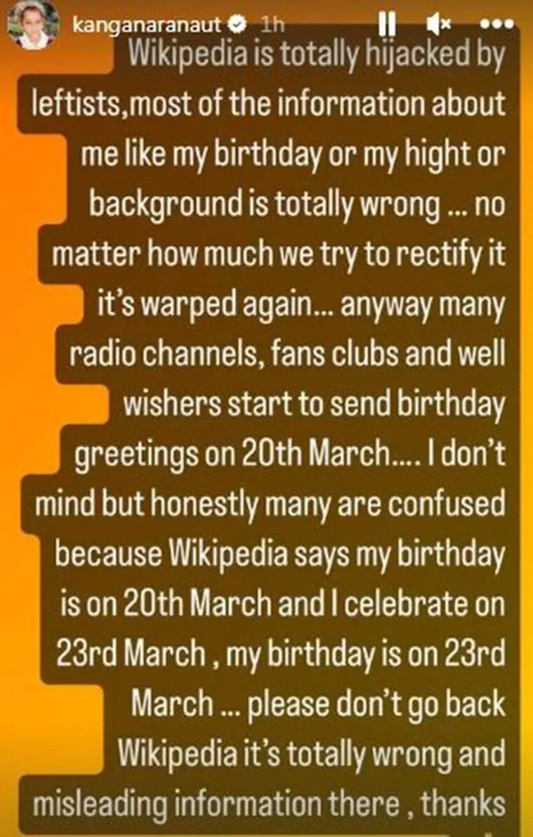 ''വിക്കിപീഡിയ പൂർണമായും ഇടതുപക്ഷക്കാരാൽ ഹൈജാക്ക് ചെയ്യപ്പെട്ടിരിക്കുന്നു, എന്റെ ജന്മദിനം, ഉയരം അല്ലെങ്കിൽ പശ്ചാത്തലം തുടങ്ങിയ എന്നെക്കുറിച്ചുള്ള മിക്ക വിവരങ്ങളും തീർത്തും തെറ്റാണ്... എത്ര തിരുത്താൻ ശ്രമിച്ചാലും അത് വീണ്ടും വളച്ചൊടിക്കപ്പെടുന്നു. നിരവധി റേഡിയോ ചാനലുകളും ഫാൻസ് ക്ലബ്ബുകളും മാർച്ച് 20-ന് ജന്മദിനാശംസകൾ അയക്കാറുണ്ട്. എനിക്ക് പ്രശ്നമില്ല, പക്ഷേ പലരും ആശയക്കുഴപ്പത്തിലാണ്. വിക്കിപീഡിയയിൽ മാർച്ച് 20-ന് ആണ് എന്റെ ജന്മദിനം രേഖപ്പെടുത്തിയിരിക്കുന്നത്. എന്നാൽ മാർച്ച് 23നാണ് എന്റെ ജന്മദിനം''- താരം സോഷ്യൽമീഡിയയിൽ കുറിച്ചു. ദയവായി വിക്കിപീഡിയ സന്ദർശിക്കരുതെന്നും അത് തികച്ചും തെറ്റാണെന്നും തെറ്റിദ്ധരിപ്പിക്കുന്ന വിവരങ്ങളാണ് അതിലുള്ളതെന്നും താരം കൂട്ടിച്ചേർത്തു.