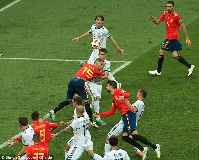 ഷൂട്ടൗട്ടില് സ്പെയിനെ തോല്പ്പിച്ചാണ് ആതിഥേയരായ റഷ്യ ലോകകപ്പിന്റെ ക്വാര്ട്ടറിലേക്കെത്തിയത്. നിശ്ചിതസമയത്തും അധിക സമയത്തും 1-1നായിരുന്നു ഗോള് നില. മത്സരം തീരാന് അഞ്ച് മിനുറ്റ് മാത്രം ബാക്കി നില്ക്കെയായിരുന്നു വിവാദ സംഭവം. സ്പാനിഷ് താരങ്ങളായ സെര്ജിയോ റാമോസിനേയും പിക്വയേയും റഷ്യന് പ്രതിരോധക്കാര് ഒരേസമയം ബോക്സില് തള്ളിയിട്ടു. അത് റഫറിയും വാറും കണ്ടില്ലെന്ന് നടിച്ചതാണ് സ്പാനിഷ് ആരാധകരെ പ്രകോപിപ്പിച്ചത്.
