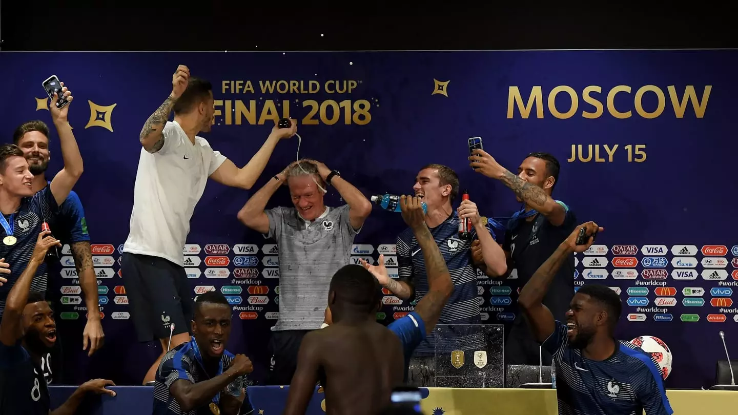 ഷാംപെയ്ന് കൊണ്ട് ദെഷാംപിസിനെ കുളിപ്പിച്ച പോഗ്ബയും, ജിറൂഡും, മറ്റൂഡിയും ഉള്പ്പടെയുള്ള താരങ്ങളും വാര്ത്ത സമ്മേളന വേദിയിലെ പോഡിയത്തില് കയറി നിന്നും ആഘോഷിച്ചു.