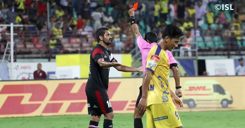 മത്സരത്തിന്റെ 23-ാം മിനിറ്റില് തന്നെ നോര്ത്ത് ഈസ്റ്റ് താരം ഗുര്വീന്ദര് സിങ് ചുവപ്പ് കാര്ഡ് കണ്ട് പുറത്തായി. ബോക്സിന് തൊട്ടുവെളിയില് മത്തേയ് പോപ്ലാറ്റ്നിക്കിനെ വീഴ്ത്തിയതിന് റഫറി ഗുര്വീന്ദറിന് നേരിട്ട് ചുവപ്പ് കാര്ഡ് കാണിക്കുകയായിരുന്നു. അതോടെ ഗിരിക് കോസ്ലയെ പിന്വലിച്ച് ലാല്റെംപുവിയ ഫനായെ നോര്ത്ത് ഈസ്റ്റ് കളത്തിലിറക്കി.