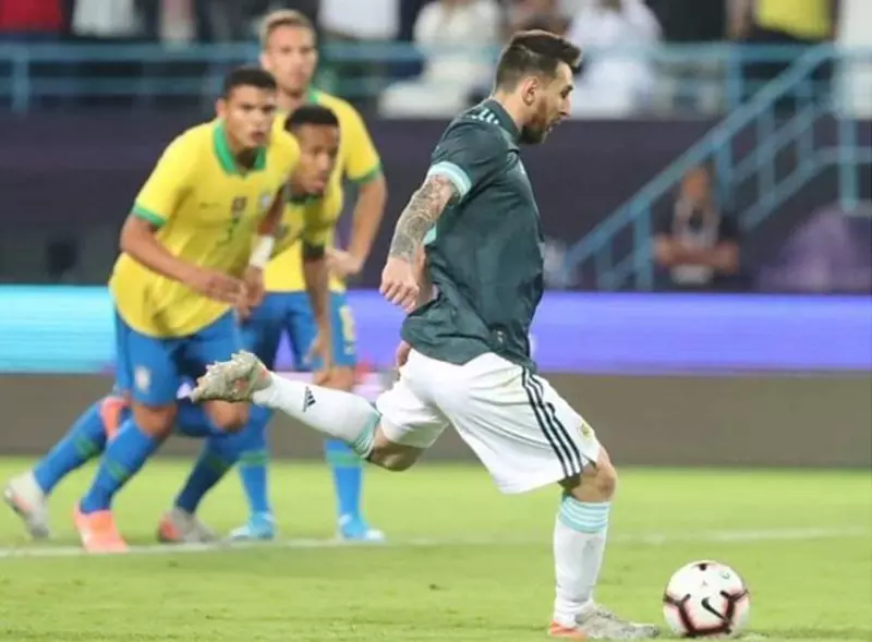 തൊട്ടുപിന്നാലെ 13-ാം മിനുട്ടിൽ അർജന്റീനക്കും പെനാൽട്ടി കിട്ടി. പന്തുമായി മുന്നേറിയ മെസ്സിയെ ബ്രസീൽ ഡിഫന്റർ ബോക്സിൽ വീഴ്ത്തിയതിനാണ് ന്യൂസിലാന്റുകാരനായ മാത്യു കോങ്ഗർ സ്പോട്ടിലേക്ക് വിരൽചൂണ്ടിയത്. കോപ അമേരിക്ക ഫൈനലിൽ ഷൂട്ടൗട്ട് കിക്ക് നഷ്ടപ്പെടുത്തിയ മെസ്സി, കിക്കെടുക്കാൻ വരുമ്പോൾ ബ്രസീൽ ആരാധകരുടെ മനസ്സിലും അർജന്റീനാ ഫാൻസിന്റെ മനസ്സിലും ഒരേ ആധിയായിരുന്നു.
