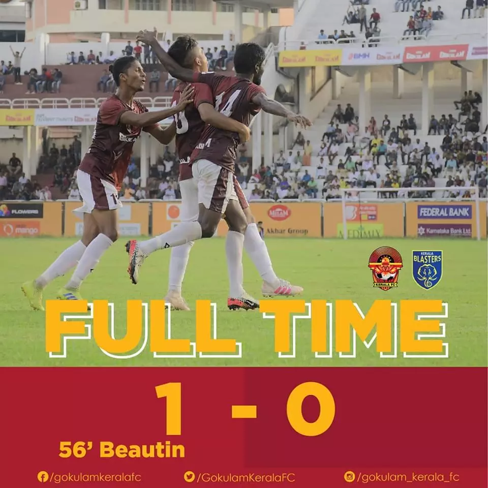 കളിയുടെ രണ്ടാം പകുതിയില് ഗോകുലത്തിന്റെ ബ്യൂട്ടിന് ആന്റണിയുടെ ബൈസിക്കിള് കിക്ക്. ബ്ലാസ്റ്റേഴ്സ് താരം ഡങ്കലിന്റെ കാലില് തട്ടി ഗോള് പോസ്റ്റിലേക്ക്. ആദ്യ പകുതിയിലെ വിരസത ഒരു ഗോള് വന്നതോടെ മാറി. ഇരു ടീമുകളും പിന്നീട് ഉണര്ന്ന് കളിച്ചു. ഇതോടെ ബ്ലാസ്റ്റേഴ്സിന്റെയും ഗോകുലത്തിന്റെയും ആരാധകരും ആവേശത്തിലായി. എം.എസ്. ജിതിന്റെ നേതൃത്വത്തിലായിരുന്നു ഗോകുലത്തിന്റെ മുന്നേറ്റങ്ങള്.