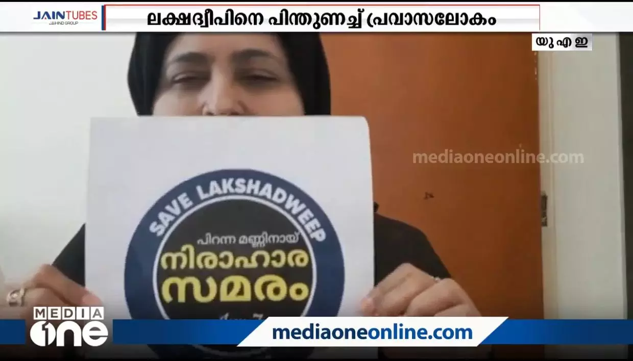 ജന്മനാടിന് കടലിനക്കരെ നിന്ന് പിന്തുണയുമായി യു.എ.ഇയിലെ ലക്ഷദ്വീപുകാർ. നാട്ടിൽ നടന്ന 12 മണിക്കൂർ നിരാഹാര സമരത്തിന് പിന്തുണയർപ്പിച്ച് യുഎഇയിലെ ദ്വീപുകാരും നിരാഹാരം അനുഷ്ഠിച്ചു. വീടുകളിൽ പ്ലക്കാർഡുയർത്തിയും സാമൂഹിക മാധ്യമങ്ങളിൽ വീഡിയോ പോസ്റ്റ് ചെയ്തുമാണ് അവർ പിന്തുണ അറിയിച്ചത്. സേവ് ലക്ഷദ്വീപ് എന്ന പ്ലക്കാർഡുയർത്തിയായിരുന്നു യു.എ.ഇ താമസ കേന്ദ്രങ്ങളിൽ ദ്വീപുകാരുടെ പ്രതിഷേധം.