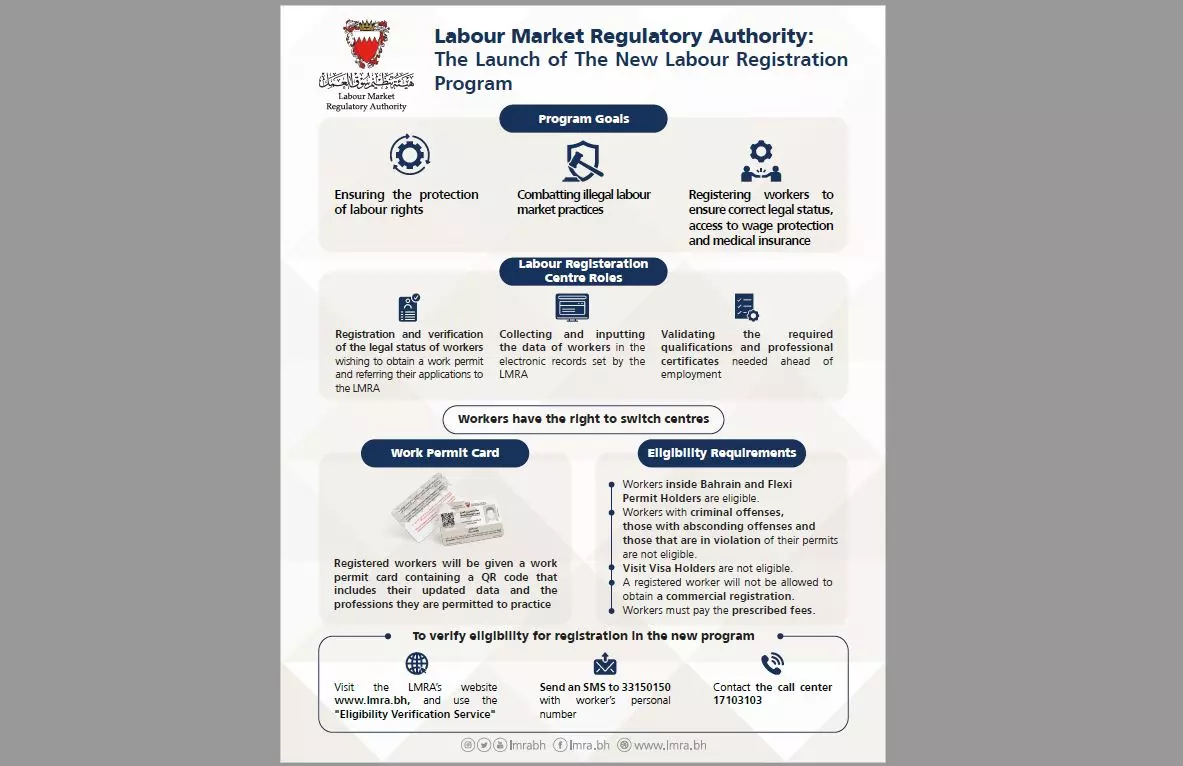 ലേബർ രജിസ്ട്രേഷൻ സെന്ററിൽ രജിസ്റ്റർ ചെയ്യാൻ യോഗ്യതയുണ്ടോ എന്നറിയാൻ www.lmra.bh എന്ന വെബ്സൈറ്റിൽ സർവീസസ് എന്ന വിഭാഗത്തിൽ Registered Worker Eligibility എന്ന ലിങ്ക് പരിശോധിക്കാം. അംഗീകൃത ലേബർ രജിസ്ട്രേഷൻ കേന്ദ്രങ്ങളുടെ പട്ടികയും എൽ.എം.ആർ.എ വെബ്സൈറ്റിൽ ലഭ്യമാക്കിയിട്ടുണ്ട്. 17506055 എന്ന കോൾ സെന്റർ വഴിയും അന്വേഷണങ്ങൾ നടത്താവുന്നതാണെന്ന് അധികൃതർ അറിയിച്ചു.
