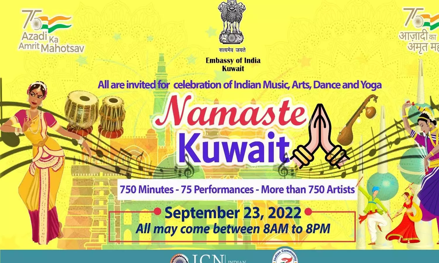 ആസാദി കാ അമൃത് മഹോത്സവിന്റെ ഭാഗമായി 'നമസ്തേ കുവൈത്ത്' എന്ന പേരിൽ ഒരുക്കുന്ന പരിപാടിയിൽ 750 ലധികം കലാകാരന്മാർ 750 മിനിറ്റ് ഇടവേളയില്ലാതെ വിവിധ കലാ പരിപാടികൾ അവതരിപ്പിക്കും. '75 കലാരൂപങ്ങൾ- 750 മിനിറ്റ്- 750-ലധികം കലാകാരന്മാർ' എന്ന പ്രമേയത്തിലാണ് പരിപാടി .കഴിഞ്ഞ ഒരു വർഷക്കാലം ആസാദി കാ അമൃത് മഹോത്സവ് കാമ്പയിന്റെ ഭാഗമായി കുവൈത്തിൽ വിവിധങ്ങളായ പരിപാടികൾ സംഘടിപ്പിച്ചിരുന്നു. ഇതിന്റെ തുടർച്ചയായാണ് എംബസ്സി ഓഡിറ്റോറിയത്തിൽ നാളെ രാവിലെ 8 മുതൽ പന്ത്രണ്ടര മണിക്കൂർ കലാവിസമയം ഒരുക്കുന്നത്.