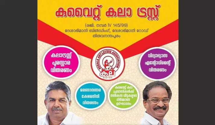 കേരള ആർട്ട് ലവേഴ്സ് അസോസിയേഷൻ, കുവൈത്തിന് കീഴിലുള്ള കല ട്രസ്റ്റ് വർഷംതോറും നടത്തിവരുന്ന അവാർഡ് ദാനവും, വിദ്യഭാസ എൻഡോവ്മെന്റ് വിതരണവും സെപ്റ്റംബർ 3 ഞായറാഴ്ച വൈകിട്ട് ആലപ്പുഴ റെയ്ബാൻ ഓഡിറ്റോറിയത്തിൽ സംഘടിപ്പിക്കുമെന്ന് ഭാരവാഹികള് അറിയിച്ചു.