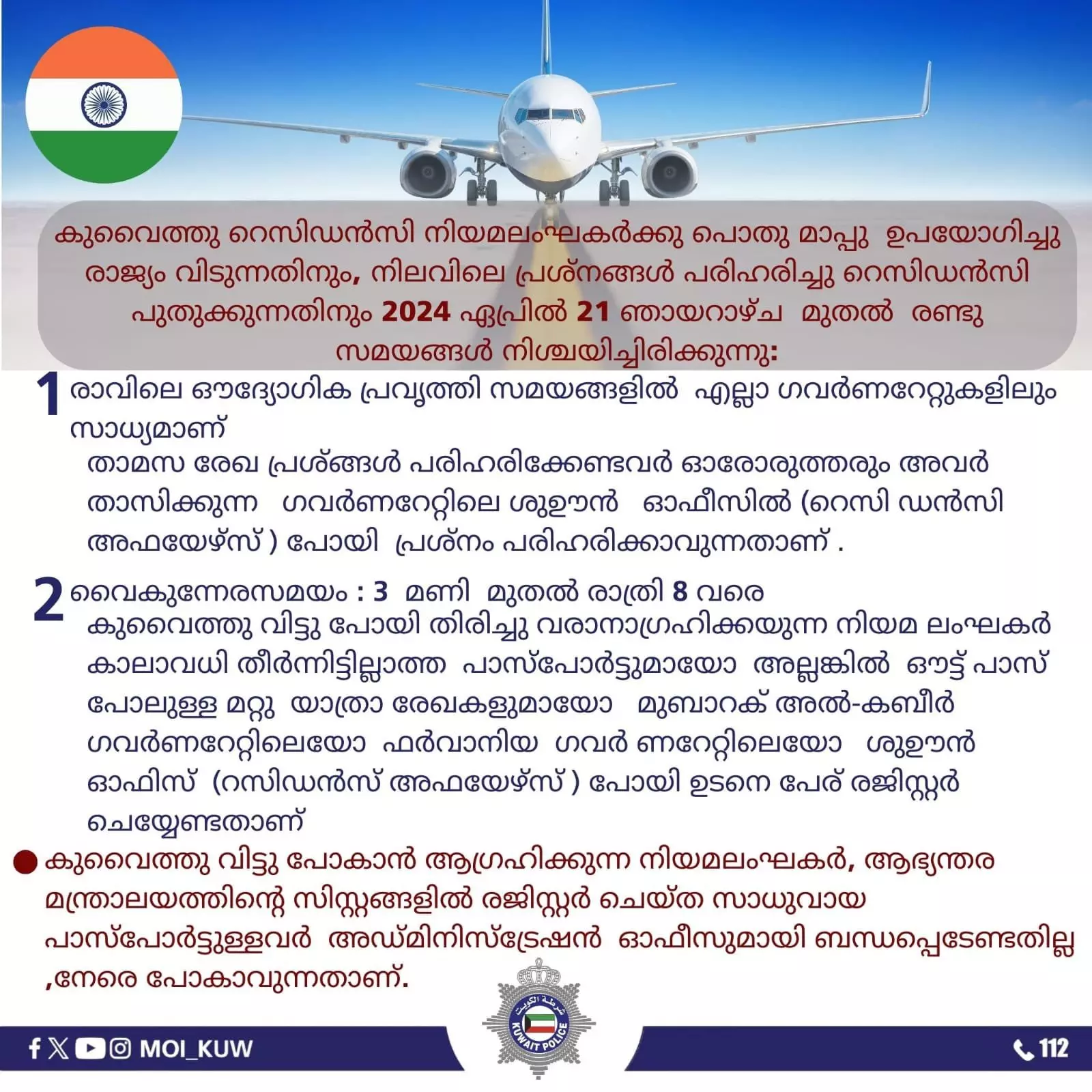 അതേസമയം, റസിഡൻസി പ്രശ്നങ്ങളും പൊതുമാപ്പും സംബന്ധിച്ചുള്ള അറിയിപ്പ് മലയാളത്തിലും കുവൈത്ത് ആഭ്യന്തര മന്ത്രാലയം പുറത്തിറക്കിയിട്ടുണ്ട്. അറബി, ഇംഗ്ലീഷ്, ഹിന്ദി, ഉർദു, തമിഴ്, ബംഗാളി, തെലുങ്ക്, കന്നഡ എന്നീ ഭാഷകൾക്കൊപ്പമാണ് മലയാളവും ഇടംപിടിച്ചത്.
