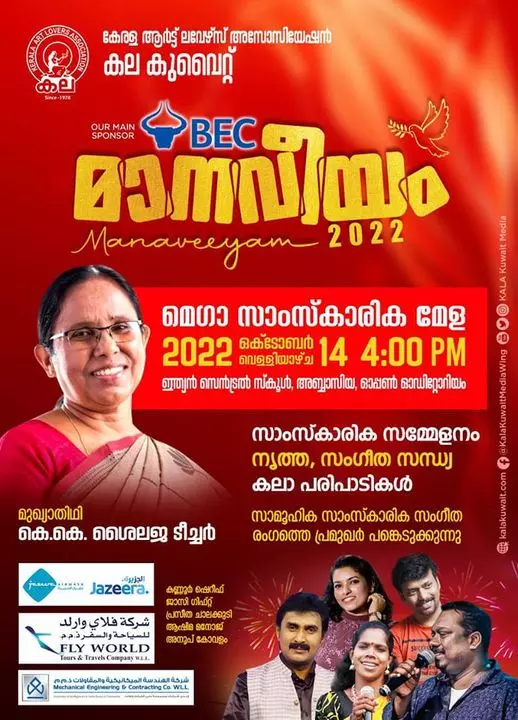 ഈ മാസം 14, വെള്ളിയാഴ്ച്ച ഇന്ത്യൻ സെൻട്രൽ സ്കൂൾ അബ്ബാസിയ ഓപ്പൺ ഓഡിറ്റോറിയത്തിൽ നടക്കുന്ന സാംസ്കാരിക മേളയില് സി.പി.ഐ.എം കേന്ദ്രകമ്മിറ്റി അംഗവും, മുൻ ആരോഗ്യ മന്ത്രിയുമായിരുന്ന കെ.കെ ശൈലജ മുഖ്യാതിഥിയായി പങ്കെടുക്കും. കല കുവൈത്തിന്റെ നേതൃത്വത്തല് നടത്തിയ സാഹിത്യ മത്സര വിജയികള്ക്കുള്ള സമ്മാനദാനവും പരിപാടിയില് നിര്വ്വഹിക്കും.