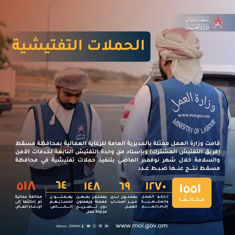തൊഴിൽ നിയമലംഘനം: മസ്കത്തിൽ അറസ്റ്റിലായത് 1551 പ്രവാസികൾ