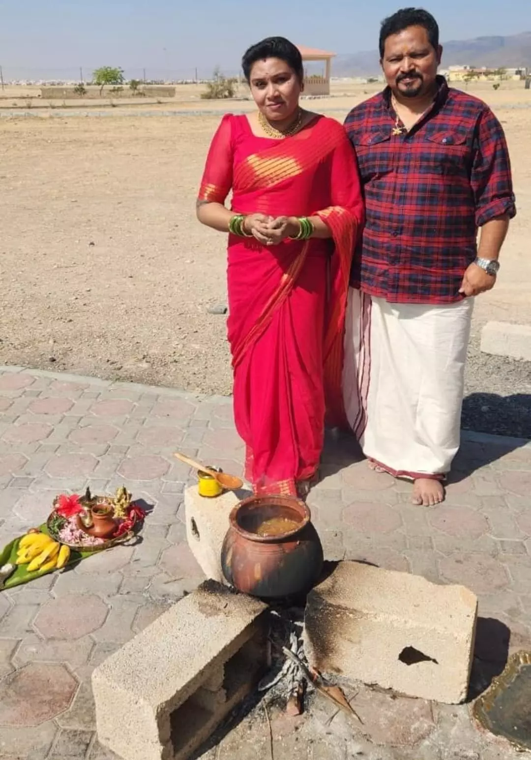 മകൻ പവനിനും ഭർത്താവ് അജിത് കുമാറിനുമൊപ്പം ഇത്തീൻ പ്രദേശത്തിന് സമീപം ഫാമിനോട് ചേർന്നാണ് അടുപ്പൊരുക്കിയിരിക്കുന്നത്. നാട്ടിൽ രാവിലെ പത്തരക്ക് തീ പകർന്നപ്പോൾ ഒമാൻ സമയം ഒമ്പതിന് ഇവിടെയും തീ പകർന്നു.