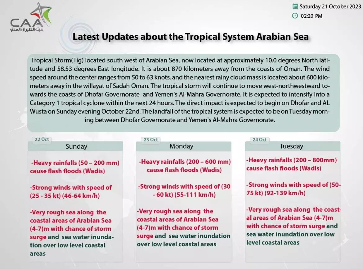 തിങ്കളാഴ്ച അർധരാത്രിക്കും ചൊവ്വാഴ്ച രാവിലെയുമായി ദോഫാർ ഗവർണറേറ്റിനും യമനിലെ അൽ മഹ്റ ഗവർണറേറ്റിനും ഇടയിലൂടെ ഇത് കടന്നുപോകാൻ സാധ്യതയുണ്ടെന്ന് മുന്നറിയിപ്പിൽ പറയുന്നു.