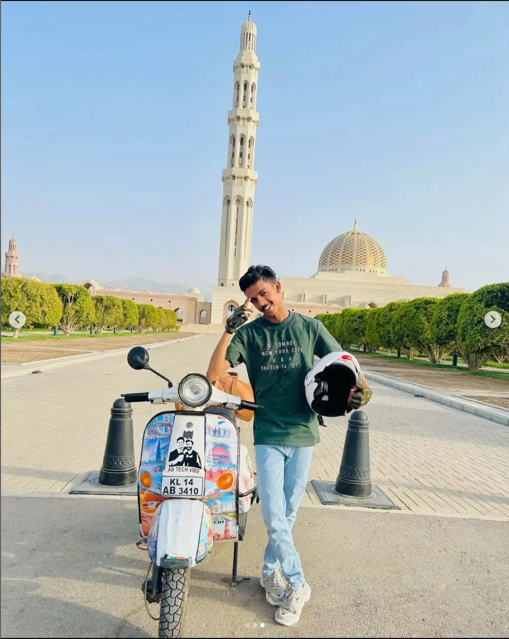 നാല് മാസം കൊണ്ട് ചേതക് സ്കൂട്ടറില് ഇന്ത്യയിലുടനീളം എണ്ണായിരം കിലോമീറ്ററോളം കറങ്ങിയ ശേഷമാണ് ഗള്ഫ് രാജ്യങ്ങളിലേക്കെത്തിയത്. ദുബൈയിലേക്ക് റോഡ് മാര്ഗ്ഗം വരാനായിരുന്നു പദ്ധതി. എന്നാല്, അഫ്ഗാന് അതിര്ത്തി പ്രദേശം കടന്നു വരാനുള്ള പ്രയാസം കാരണം സ്കൂട്ടര് ദുബൈയിലേക്ക് ഷിപ്പില് എത്തിക്കുകയായിരുന്നു.