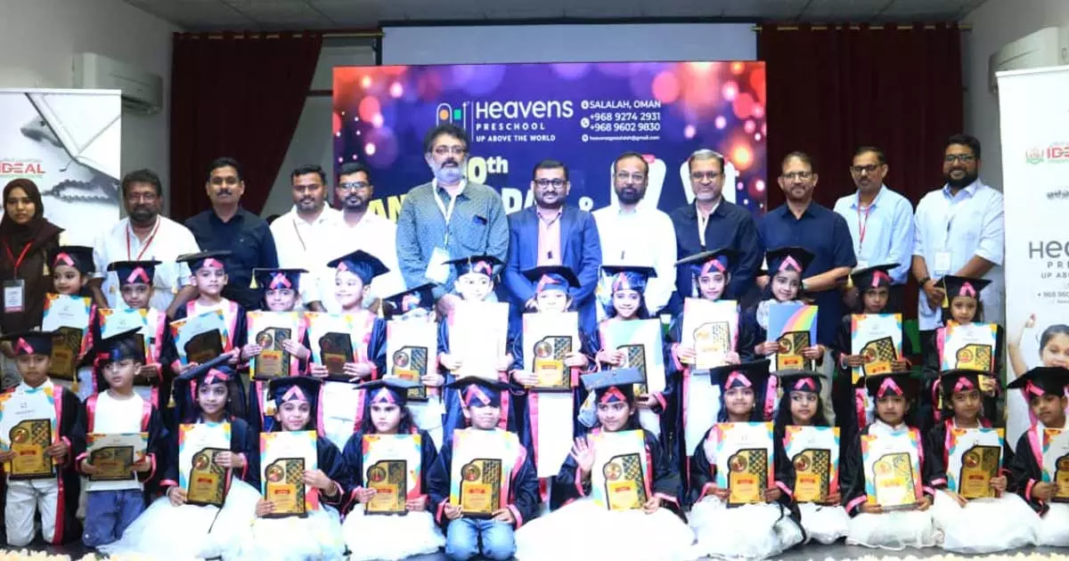 |സലാല: സ്വകാര്യ വിദ്യാഭ്യാസ സ്ഥപനമായ ഹെവൻസ് പ്രീ സ്കൂൾ സലാലയിൽ പത്താം വാർഷികം ആഘോഷിച്ചു. ഐഡിയൽ ഹാളിൽ നടന്ന പരിപാടിയിൽ പ്രീ സ്കൂൾ ബിരുദ ധാനവും നടന്നു. യൂണിവേഴ്സിറ്റി ഓഫ് ടെക്നോളജി ആന്റ് അപ്ളൈഡ് സയൻസിലെ ഡോ: അബ്ദുൽ റഅൂഫ് അഹമ്മദ് പരിപാടി ഉദ്ഘാടനം ചെയ്തു. ഐഡിയൽ എജ്യുക്കേഷൻ സെന്റർ ചെയർമാൻ കെ.ഷൗക്കത്തലി മാസ്റ്റർ അധ്യക്ഷത വഹിച്ച പരിപാടിയിൽ മുഹമ്മദ് സിയാദ്, അൽ അമീൻ, നാസർ പെരിങ്ങത്തൂർ, മുസാബ് ജമാൽ എന്നിവർ സംബന്ധിച്ചു. വിദ്യാർഥികൾക്ക് സർട്ടിഫിക്കറ്റും ഉപഹാരങ്ങളും നൽകി.