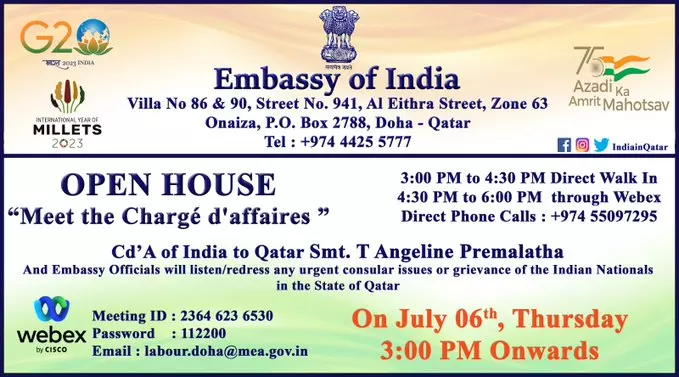 പരാതികള് എംബസി ചാര്ജ് ഡി അഫയേഴ്സ് ടി. ആഞ്ജലീന പ്രേമലത നേരിട്ട് സ്വീകരിക്കും. എംബസിയില് നേരിട്ടെത്തി വൈകിട്ട് മൂന്ന് മുതല് നാലര വരെ ഓപ്പണ് ഹൌസില് പങ്കെടുക്കാം. ഓണ്ലൈന് വഴി നാലര മുതല് ആറ് വരെയാണ് ഓപ്പണ് ഹൌസ് നടക്കുക.
