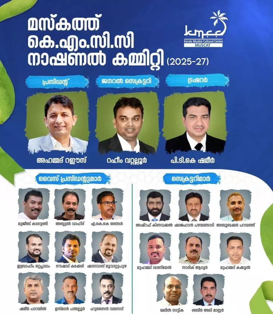 മസ്കത്ത്: ഒമാനിലെ മസ്കത്ത് കെഎംസിസിയുടെ പുതിയ നാഷണൽ കമ്മിറ്റി നിലവിൽ വന്നു. പ്രസിഡന്റായി അഹമ്മദ് റയീസിനെയും ജനറൽ സെ ക്രട്ടറിയായി റഹീം വറ്റല്ലൂരിനെയും ട്രഷററായി ഷമീർ പിടികെയെയും തെരഞ്ഞെടുത്തു. വെള്ളിയാഴ്ച നടന്ന കൗൺസിൽ യോഗത്തിൽ മുസ്ലിം ലീഗ് സംസ്ഥാന ജനറൽ സെക്രട്ടറി അഡ്വ. പിഎംഎ സലാം തെരഞ്ഞെടുപ്പ് നിയന്ത്രിച്ചു. നാഷണൽ കമ്മിറ്റി ഭാരവാഹി പട്ടിക പ്രഖ്യാപനം റിട്ടേണിംഗ് ഓഫീസർ കൂടിയായ പിഎംഎ സലാം നിർവഹിച്ചു.