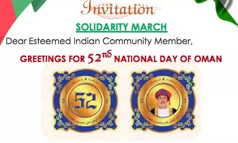 ഒമാന്റെ അമ്പത്തി രണ്ടാം ദേശീയ ദിനത്തോടനുബന്ധിച്ച് സലാല വാലി ഓഫീസ് സംഘടിപ്പിക്കുന്ന ഐക്യാദാർഢ്യ മാർച്ച് ഇന്ന് വൈകിട്ട് നടക്കും. മാർച്ചിൽ ഇന്ത്യൻ സമൂഹം സോഷ്യൽ ക്ലബ്ബിന്റെ ബാനറിൽ അണിനിരക്കുമെന്ന് പ്രസിഡന്റ് രാകേഷ് കുമാർ ജാ അറിയിച്ചു. ഇതിനായി എല്ലാ ഇന്ത്യക്കാരും വൈകിട്ട് 3.45ന് സുൽത്താൻ ഖാബൂസ് മസ്ജിദ് പരിസരത്ത് എത്തിച്ചേരണം.