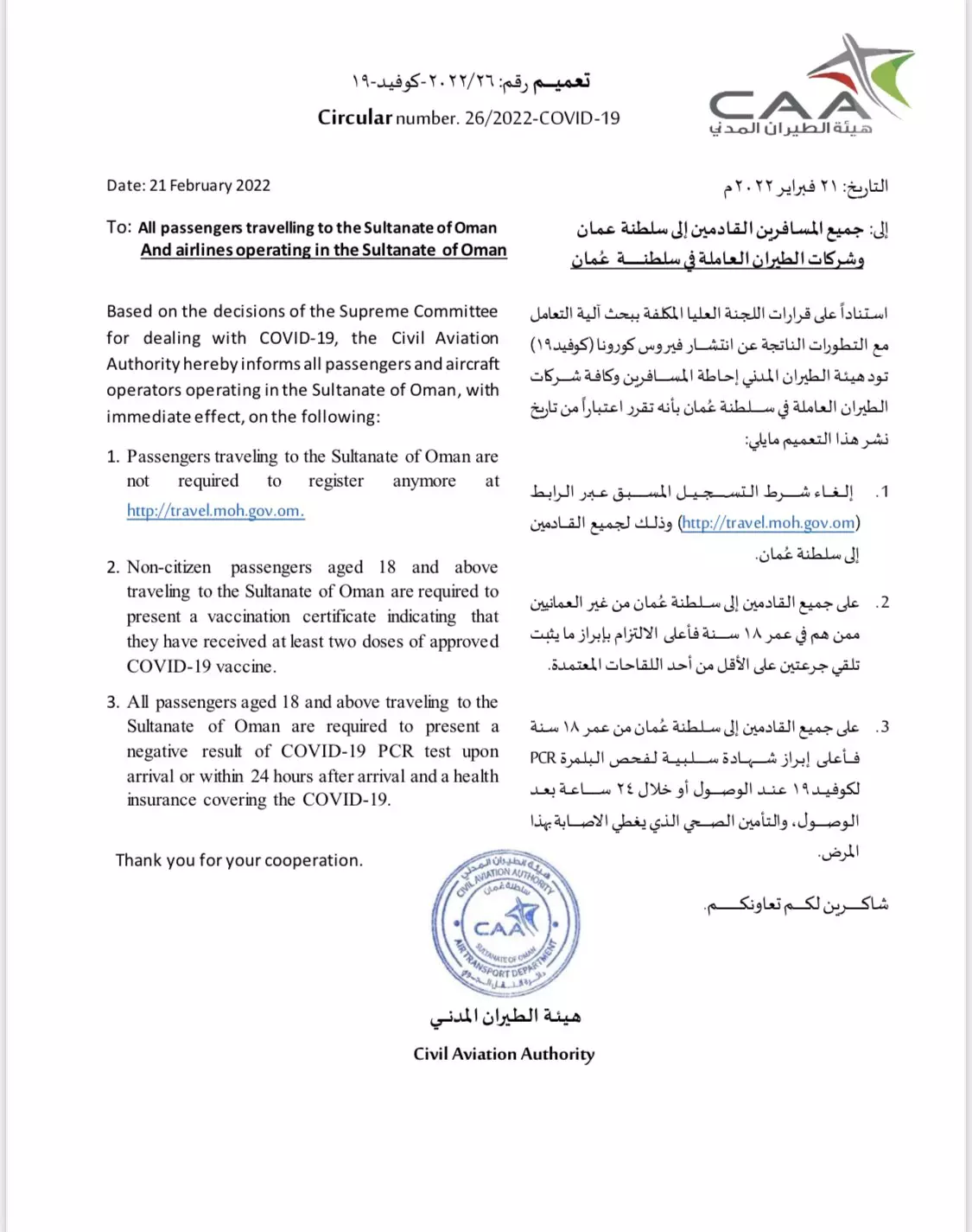 ഒമാനിലേക്ക് യാത്ര ചെയ്യുന്നവർ ആരോഗ്യ മന്ത്രാലയത്തിന്റെ വെബ്സൈറ്റിൽ ഇനി രജിസ്റ്റർ ചെയ്യേണ്ടതില്ലെന്ന് സിവിൽ ഏവിയേഷൻ അതോറിറ്റി അറിയിച്ചു. സിവിൽ ഏവിഷയഷൻ അതോറിറ്റിയുടെ ഏറ്റവും പുതിയ സർക്കുലറിലാണ് ഇക്കാര്യം പറയുന്നത്. അതേ സമയം 18 വയസിന് മുകളിലുള്ള യാത്രക്കാർ രണ്ട് ഡോസ് വാക്സിൻ സ്വീകരിച്ചതിന്റെ സർട്ടിഫിക്കറ്റ് ഹാജരാക്കണം.