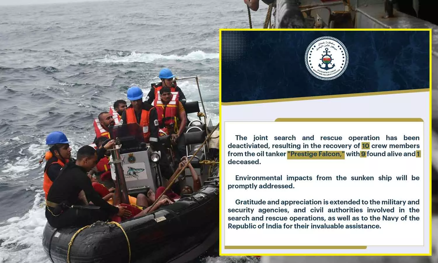 മസ്കത്ത്: ഒമാനിൽ അൽവുസ്ത ഗവർണറേറ്റിലെ ദുകം തീരത്തോട് ചേർന്നുണ്ടായ പ്രസ്റ്റീജ് ഫാൽക്കൺ എണ്ണക്കപ്പൽ അപകടത്തിൽപ്പെട്ടവർക്കായുള്ള രക്ഷാ പ്രവർത്തനം അവസാനിപ്പിച്ചാതായി ഒമാൻ മാരിടൈം സെക്യൂരിറ്റി സെൻറർ അറിയിച്ചു. എട്ട് ഇന്ത്യക്കാരെയും ഒരു ശ്രീലങ്കക്കാരനെയും രക്ഷപ്പെടുത്തിയിരുന്നു. ഇന്ത്യക്കാരനായ ഒരാൾക്ക് ജീവൻ നഷ്ടപ്പെടുകയും ചെയ്തിരുന്നു. കാണാതായ മറ്റുള്ളവർക്കുവേണ്ടിയുള്ള തിരച്ചിലാണ് ഇപ്പോൾ അവസാനിപ്പിച്ചിരിക്കുന്നത്.