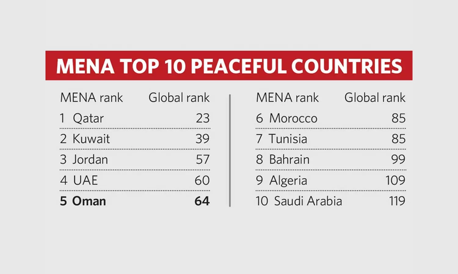|മിഡിലീസ്റ്റ്, വടക്കൻ ആഫ്രിക്കൻ രാജ്യങ്ങൾ ഉൾക്കൊള്ളുന്ന മേഖലയിൽ മൂന്നാം സ്ഥാനത്താണ് ഒമാൻ