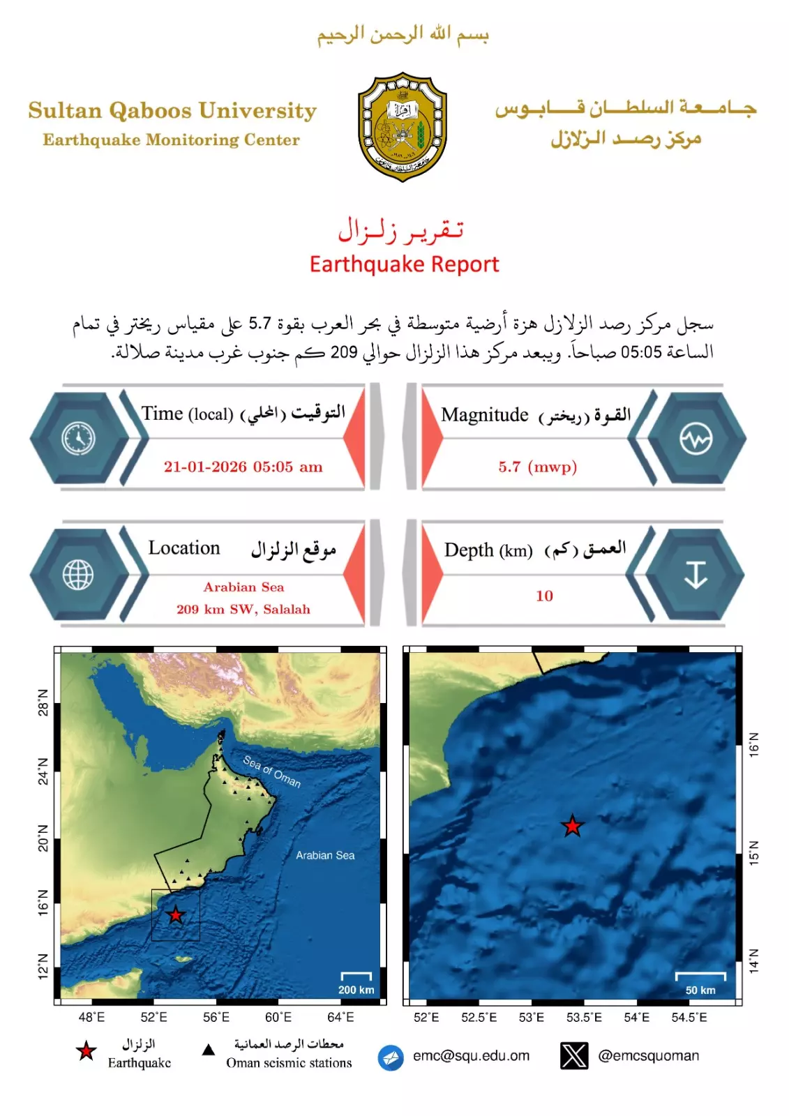 പ്രാദേശിക സമയം പുലർച്ചെ 2:19 ന് ആദ്യം ചെറിയ ഭൂ ചലനം ഉണ്ടായതായി കേന്ദ്രം റിപ്പോർട്ട് ചെയ്തു. റിക്ടർ സ്കെയിലിൽ 3.5 തീവ്രതയാണ് രേഖപ്പെടുത്തിയത്. ഈ ഭൂചലനത്തിന്റെ പ്രഭവകേന്ദ്രം സലാലയിൽ നിന്ന് ഏകദേശം 263 കിലോമീറ്റർ തെക്ക് പടിഞ്ഞാറായി ഏകദേശം 35 കിലോമീറ്റർ ആഴത്തിലായിരുന്നു.