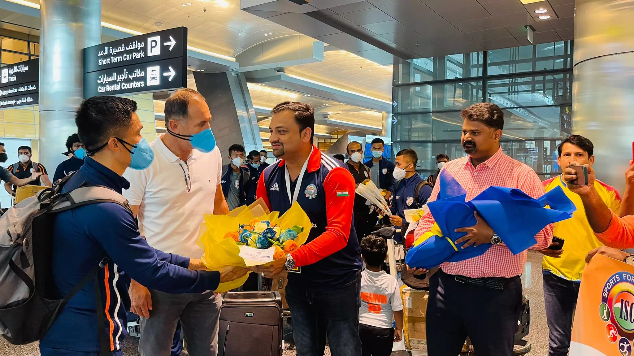 ജോര്ദാനെതിരായ സൗഹൃദ മത്സരത്തിനായി ഇന്ത്യന് ഫുട്ബോള് ടീം ഖത്തറില് എത്തി. ദോഹ ഹമദ് രാജ്യാന്തര വിമാനത്താവളത്തില് എത്തിയ ടീമീന് ഇന്ത്യന് സ്പോര്ട്സ് സെന്ററും മഞ്ഞപ്പടയും സ്വീകരണം നല്കി.
