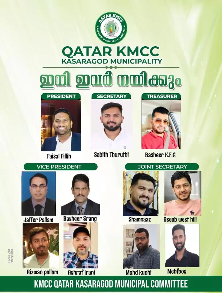 ഖത്തർ കെ.എം.സി.സി കാസർകോട് മുനിസിപ്പൽ കമ്മിറ്റിക്ക് പുതിയ ഭാരവാഹികളായി. ഫൈസൽ ഫില്ലിയാണ് പ്രസിഡന്റ്. സാബിത്ത് തുരുത്തിയെ ജനറൽ സെക്രട്ടറിയായും ബഷീർ കെ.എഫ്.സിയെ ട്രഷററായും തെരഞ്ഞെടുത്തു.